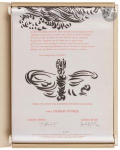 illustrée de 7 eaux-fortes originales de Jacques HÉROLD (1910-1987). Le texte est imprimé en rouge et les illustrations en noir sur de la soie blanche se déroulant à l’aide de deux cylindres à l’intérieur d’un emboîtage spécial conçu par Jean Duval...Tirage à 50 exemplaires signés par l’auteur et l’artiste, celui-ci un des 35 numérotés en chiffres arabes...Exemplaire parfaitement conservé...On joint :.- HÉROLD (Jacques) - BUTOR (Michel). Dialogues des règnes. Vaduz : Brunidor, 1967. — In-folio, 335 x 260 : (38 ff. 2 premiers et 2 derniers blancs), couverture imprimée. En feuilles, couverture rempliée, chemise et étui en toile de l’éditeur...Édition originale illustrée de 15 grandes compositions gravées sur cuivre par Jacques HÉROLD..Il est indiqué sous la justification que « L’ordre des 15 planches est à votre gré »..Tirage à 95 exemplaires sur grand vélin d’Arches, signés par l’auteur et l’illustrateur au colophon ; celui-ci est l’un des 75 numérotés en chiffres arabes..Exemplaire parfaitement conservé.