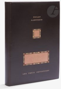 LABOUREUR (Jean-Émile) - TOULET (Paul Jean)..Les Trois impostures..Paris : Creuzevault, [1946]. — In-8, 252 x 177 : 106 pp., (7 ff. dernier blanc), couverture illustrée. Box marron foncé, premier plat orné de deux incrustations de galuchat...