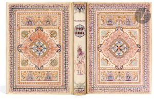 d’un riche décor oriental peint en couleurs, dos lisse orné de motifs orientaux peints en couleurs, frise orientale peinte en couleurs à l’intérieur, doublures et gardes de soie moirée rouge, tranches dorées sur témoins, doubles gardes, couverture et dos conservés, chemise à dos de parchemin blanc orné du titre et de dessins originaux peints, étui (G. Levitzky)...Édition très recherchée de ce superbe ouvrage sur la Thaïlande, illustré de 50 aquarelles en couleurs, dont 10 à pleine page, ainsi que de divers ornements, compositions décoratives à pleine page, bandeaux et vignettes d’après l’artiste peintre orientaliste et voyageur Joseph de LA NÉZIÈRE (1873-1944). Le titre indique par erreur H. de La Nézière...L’édition fut tirée à 350 exemplaires ; celui-ci est l’un des 62 sur japon, spécialement imprimé pour le relieur Grégoire Levitzky (1885-1969), enrichi d’une suite des aquarelles sur papier vélin, en bistre ou en bleu, et d’une épreuve rehaussée de la planche de la page 103, reliée en tête...Superbe exemplaire dans une spectaculaire reliure peinte de Levitzky, réalisée pour sa collection personnelle. Il a pris soin de l’orner d’un décor d’une grande richesse et d’une grande finesse..Exemplaire enrichi du prospectus de parution.