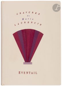 violet sur une base de box lilas, nom de l’auteur en lettres violettes et bordeaux au-dessus de l’éventail et titre en lettres bordeaux en-dessous, dos lisse, doublures et gardes de nubuck blanc, tête dorée, non rogné, couverture et dos conservés, chemise à dos et bandes à recouvrement de box beige, étui (Marie-José Guian 2016)...Édition illustrée de 10 eaux-fortes originales de Marie LAURENCIN (1883-1956), accompagnées de poésies de Louise Colet, Jean Pellerin, Roger Allard, André Breton, Francis Carco, M. Chevrier, F. Fleuret, G. Gabory, Max Jacob, Valery Larbaud et André Salmon...Un des 327 exemplaires numérotés sur papier vergé de Hollande, seul grand papier après seulement 8 exemplaires sur papier vergé bleuté du XVIIIe siècle...Bel exemplaire relié sur onglets par Marie-José Guian pour son compte personnel. On peut simplement regretter de légers défauts dans le découpage en haut des lanières composant l’éventail sur le premier plat.