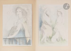plats recouverts de papier chiffon à décor floral imprimé en blanc, dos lisse, non rogné, première de couverture conservée (M.J. Guian-Milliaud)...Très belle édition tirée à 480 exemplaires, illustrée d’une vignette en noir sur le titre, reprise sur la couverture, et de 5 grandes lithographies en couleurs sur chine monté de Marie LAURENCIN (1883-1956), comprises dans la pagination..Un des 450 exemplaires sur papier vélin..Bel exemplaire relié par Marie-Josée Guian pour son compte..La fragile couverture, dont seul le premier plat a été conservé, a été collée et placée sous passe-partout.