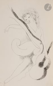 cadre de métal doré, incrusté au centre du premier plat, dos lisse, non rogné, couverture et dos conservés, emboîtage à dos plat et coins de box beige (M. J. Guian-Milliaud)...Édition tirée à 180 exemplaires, illustrée de 13 eaux-fortes originales de Marie LAURENCIN (1883-1956), dont une en frontispice...Un des 134 exemplaires imprimés sur papier pur fil Lana...Très bel exemplaire relié par Marie-Josée Guian pour son compte personnel, qui a incrusté une miniature originale peinte du XVIIIe siècle, de l’époque de Louis XV d’après une note au dos, représentant le visage d’une femme. Elle a également placé l’étiquette de l’étui d’origine dans la seconde doublure de l’emboîtage.