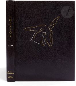 LAURENS (Henri) - LUCIEN DE SAMOSATE..Loukios ou l’âne..Paris : Tériade, 1947. — In-4, 290 x 209 : (4 ff. 3 premiers blancs), 88 pp., (4 ff.), couverture illustrée. Maroquin noir, plat supérieur orné d’une tête d’âne dessinée à...