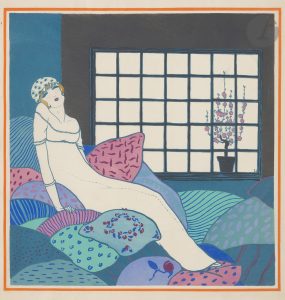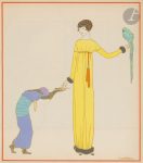 planches montées sur onglets et coloriées au pochoir avec rehauts d’or et d’argent par Saudé, sur une note orientalisante totalement novatrice pour la mode féminine de l’époque. Paul Poiret lance, selon son expression, des coupes et des couleurs « comme des loups dans une bergerie »..Cet album est considéré par beaucoup comme le plus beau livre sur la mode de l’époque..Tirage limité à 1.000 exemplaires, celui-ci étant l’un des 700 comprenant les planches sur japon sans remarques..Exemplaire parfaitement conservé, malgré les habituelles décharges des planches.