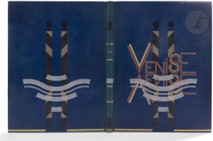 froid et de maroquin noir et gris, séparées par un filet à froid en creux, partie inférieure décorée de larges bandes ondulées symbolisant des vagues, composées de points au palladium, sur le premier plat figure également le titre « Venise » fait de lettres composées de listels de maroquin bleu clair et rose, soulignés de points dorés aux lettres V et S, placé au-dessus de la séparation centrale et répété à l’identique symétriquement en-dessous, listel de maroquin bleu clair surmonté d’une bande de points dorés longeant le bord inférieur des plats et du dos, coupés au centre des plats sur 5,5 cm ; maroquin bleu foncé en encadrement à l’intérieur, orné de filets et bandes de points dorés, de bandes de maroquin noir et de motifs à froid représentant le haut de 4 palines, doublures et gardes de daim vert, doubles gardes, non rogné, couverture et dos conservés, étui (Pierre Legrain)...Charmante édition publiée et illustrée par Henri LE RICHE (1870-1944), comprenant un cadre en bistre pratiquement à chaque page, y compris au titre et au colophon, le lion de Venise gravé en rouge à pleine page en tête de l’ouvrage, 7 eaux-fortes en couleurs dont une à pleine page et 6 dans le texte, et 4 planches en noir...L’édition ne fut tirée qu’à 162 exemplaires numérotés sur papier de Hollande Van Gelder signés par l’artiste au colophon, celui-ci est enrichi d’une suite en noir des 11 eaux-fortes avec remarque...Superbe exemplaire en reliure de Pierre Legrain..Dos passé et reteinté.