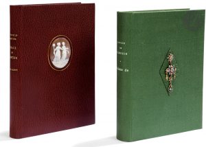 pâtes de verre bleu turquoise incorporé au centre du premier plat sur une pièce de toile verte foncée en losange, dos lisse, doublures et gardes de velours vert clair, non rogné, couverture et dos conservés, étui-boîte à dos et coins de chagrin vert (Marie-José Guian-Milliaud)...Édition tirée à 3250 exemplaires, illustrée de 18 compositions en couleurs, dont 14 à pleine page, d’André-Édouard MARTY (1882-1974)..Un des 250 premiers exemplaires sur vélin pur chiffon de Lana, contenant une suite en noir des illustrations..Très bel exemplaire, entièrement monté sur onglets, relié par Marie-José Guian. Le premier plat est orné d’un véritable bijou de la fin du XIXe siècle..Provenance : Marie-José Guian, avec ex-libris...On joint :.- MARTY (André-Édouard) - GAUTIER (Théophile). Émaux et camées. Paris : H. Piazza, [1943]. — In-12, 198 x 138 : 218 pp., (3 ff. dernier blanc), couverture illustrée. Maroquin brun, camée coquille représentant 2 jeunes filles incrusté dans le premier plat, dos lisse, filet doré en encadrement à l’intérieur, doublures et gardes de soie moirée verte, tête dorée, non rogné, couverture et dos conservés, étui-boîte à dos plat et coins de maroquin brun (M. J. Guian-Milliaud)...Édition illustrée de 29 compositions en couleurs d’André-Édouard MARTY (1882-1974), dont une sur la couverture, une sur le titre, une à pleine page et 26 dans le texte. On compte également 71 vignettes décoratives, dont une en quatrième de couverture, 33 en tête de poèmes et 37 culs-de-lampe..Exemplaire du tirage ordinaire, très bien relié par Marie José Guian. Le premier plat comprend un camée coquille de la fin du XIXe siècle, représentant deux femmes dont l’une tient un bâton sur lequel est posé un bonnet phrygien.