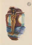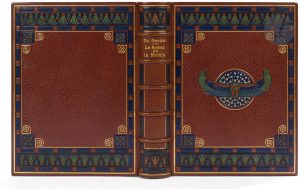filets dorés, de bandes mosaïquées de maroquin bleu et marron et de motifs de fleurs de lotus de maroquin vert sur un fond de maroquin noir, scarabée ailé mosaïqué de maroquin marron, vert et bleu sur un cercle de maroquin bleu foncé orné de points et d’étoiles dorés au centre sur le premier plat, dos à nerfs orné de motifs mosaïqués, encadrement de maroquin marron à l’intérieur, orné d’une bande de maroquin bleu entre deux filets dorés et d’un carré de maroquin bleu orné d’une fleur de maroquin vert et de pastilles marron aux angles, doublures de maroquin bleu, gardes de soie brique, doubles gardes, tranches dorées sur témoins, couverture et dos conservés, étui (Noulhac 1923)...Belle édition tirée à 1225 exemplaires, illustrée de plus de 120 compositions de Georges ROCHEGROSSE (1859-1938), dont 21 eaux- fortes gravées par Eugène Decisy, comprenant un frontispice, 2 figures dans le texte et 18 hors-textes, ainsi que plus de 100 bois en couleurs répartis sur la couverture et dans le texte...Un des 30 premiers exemplaires sur grand japon impérial, contenant 4 états des eaux-fortes (en couleurs à la poupée avant la lettre avec remarque sur vélin, eaux-forte pure avec remarque, avant la lettre avec remarque et avec la lettre, les 3 sur japon), et 2 suites des bois en couleurs sur japon et en noir sur chine...Précieux exemplaire en reliure mosaïquée et doublée de l’époque réalisée par Noulhac d’après une maquette de Madame Noulhac, enrichi d’une aquarelle originale signée de Rochegrosse...Exemplaire parfaitement conservé..Provenance : Aimé Laurent, avec ex-libris.