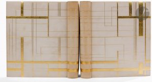 couverture illustrée. Maroquin blanc, plats et dos ornés d’un décor de larges bandes et de filets dorés horizontaux et verticaux s’entrecroisant, dos lisse, encadrement de maroquin blanc à l’intérieur, orné de filets dorés, doublures de soie brun foncé, gardes de soie moirée rouge, tranches dorées sur témoins, couverture et dos conservés, chemise à dos et bandes à recouvrement de box brun foncé, étui (F.-L. Schmied - G. Cretté succ. de Marius Michel)...Brillante édition tirée à 160 exemplaires sur papier japon, illustrée de 57 superbes compositions en couleurs de François-Louis SCHMIED (1873-1941), dont 1 frontispice, 15 têtes de chapitres, 15 lettrines, 11 culs-de-lampe, 1 vignette pour le colophon et 14 planches. Les hors-textes et les têtes de chapitres portent la signature imprimée de l’artiste...Un des 20 exemplaires hors commerce, signés par l’éditeur, celui-ci enrichi des 15 planches de la Suite pour Kim, ainsi que d’une suite en couleurs sur japon des 30 hors-textes et des 15 têtes de chapitres. On trouve dans cette suite deux épreuves du frontispice et deux états de l’avant dernière planche. Toutes les épreuves portent la signature imprimée de l’artiste...Superbe reliure réalisée par Cretté, orné d’un décor dessiné par François-Louis Schmied. La maquette originale de ce décor a été reliée à la fin du second volume...Exemplaire très bien conservé. Dos assombris..Provenance : Ex-libris LV.