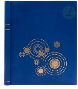 cercles et ronds dorés sur le premier plat, dos lisse, doublures et gardes de daim bleu clair, tête dorée, non rogné, couverture et dos conservés, emboîtage à dos et bords de maroquin bleu (M. J. Guian-Milliaud)...Édition originale conçue, mise en page, typographiée et illustrée par François-Louis SCHMIED (1873-1941), marquant la troisième collaboration de l’artiste avec le docteur Mardrus..Elle comprend 31 bois en couleurs, avec rehauts d’or et d’argent, dont un sur le titre et 6 à pleine page...Tirage à 177 exemplaires sur papier japon, numérotés et signés par Schmied...Très bel exemplaire relié par les soins de Marie-Josée Guian pour son propre compte. Le décor du premier plat s’inspire de l’une des illustrations.