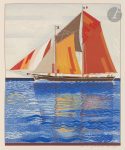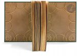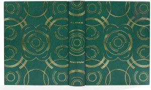 ornés d’un décor symétrique de cercles entiers et partiels faits de filets dorés et noir ainsi que de points dorés, dos lisse, doublures de maroquin gris orné d’un décor comme sur les plats, gardes de soie moirée verte, doubles gardes, tranches dorées sur témoins, couverture et dos conservés, chemise à dos et bandes à recouvrement de maroquin vert, étui (Semet et Plumelle)...Édition originale de l’un des livres les plus personnels et les plus réussis de François-Louis SCHMIED, constituant le journal de bord qu’il a tenu sur sa goélette Peau-Brune lors d’une croisière réalisée de juillet à octobre 1927...L’artiste a composé pour l’occasion pas moins de 120 dessins dont 2 à pleine page, gravées sur bois en couleurs sous la direction de Théo Schmied. Il conçut également la mise en page de l’ouvrage, pour le moins non conventionnelle ; il s’en explique dans son texte de présentation : « Peut-être me reprochera-t-on l’apparent déséquilibre de mes pages ? Déséquilibre : non. Asymétrie : certainement, j’en ai le goût. Il m’a toujours semblé que la symétrie était le reflet d’une paresse d’esprit qui se contente de n’inventer que la moitié ou même le quart d’une œuvre. L’asymétrie demande un effort plus soutenu et varié. Un noble décor ne saurait être fragmentaire, c’est-à-dire répétition d’un motif à extension illimitée. Il doit dérouler son rythme propre et complet sur la surface donnée. »..Tirage à 135 exemplaires sur papier vélin, signés par Schmied. Celui-ci, portant le n° 134, est l’un des 15 de collaborateurs, avec une double suite des illustrations, en noir et en couleurs sur vélin. Ces deux suites sont numérotées 39...Superbe exemplaire en reliure doublée de Semet et Plumelle, enrichi de la décomposition des couleurs de la seconde illustration à pleine page, justifiée : « « États » N° XXXIX de la planche «L’oiseau replie ses voiles» »...Légères craquelures aux charnières de la chemise..Provenance : ex-libris AL.