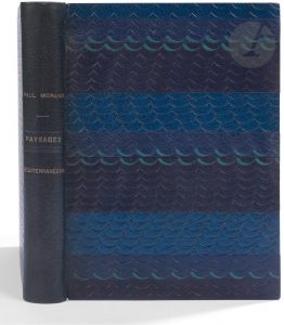 SCHMIED (François-Louis) - MORAND (Paul)..Paysages méditerranéens..Paris : [François-Louis Schmied], 1933. — In-8, 261 x 188 : 119 pp., (4 ff. dernier blanc), couverture gaufrée. .— Maroquin bleu, premier plat composé d’un jeu de bandes...