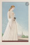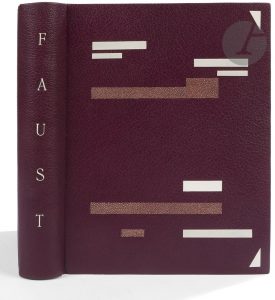 Maroquin bordeaux, premier plat orné de 3 larges bandes horizontales de galuchat incrustées, et de 6 rectangles et 2 triangles de bakélite blanche collés, dos lisse, doublures et gardes de daim bordeaux, non rogné, couverture et dos conservés, chemise à dos et bandes à recouvrement de maroquin bordeaux, étui (M. J. Guian Milliaud)...Édition rare de l’un des derniers livres illustrés par François-Louis SCHMIED (1873-1941), ornée de 66 compositions de l’artiste, dont 20 à pleine page, 24 têtes de « scène » et 22 culs-de-lampe...On trouve cette intéressante indication bibliographique à la fin de l’ouvrage : .« F. L. Schmied a établi la maquette de cette édition qu’il a ornée de 66 compositions originales. Il commença son travail en Janvier 1929 sous le patronage d’un groupement de bibliophiles présidé par Louis Barthou. Ses premières compositions furent exposées au Pavillon de Marsan en 1932. Par suite de circonstances imprévisibles elles ne purent être exécutées en gravures. Repris en 1936 avec de nouvelles compositions et aux dépens de Monsieur Charles Henchoz, l’ouvrage fut gravé sur bois, composé typographiquement et imprimé par Théo. Schmied fils sous la direction de son père. Il fut achevé dans toutes ses parties le jour de la Noël 1938. »..L’édition fut tirée à 100 exemplaires sur papier vélin, signés par Schmied, plus 6 exemplaires dits de collaborateurs...Celui-ci, numéroté 17, fait partie des 20 premiers enrichis d’une double suite en noir et en couleurs des illustrations sur japon. Ces deux suites ont ici été reliées à part dans un volume en demi-maroquin bordeaux à coins ; elles sont en outre complètes de leur couverture imprimée...Très bel exemplaire relié par Marie Josée Guian pour son compte personnel.