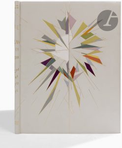 VILLON (Jacques) - RACINE (Jean)..Cantique Spirituel..[Paris : Raoul Mortier, 1945]. — In-folio, 429 x 325 : (10 ff. dernier blanc), couverture muette. Box bleu très clair, premier plat orné d’une mosaïque irradiante de veaux et de maroquins...