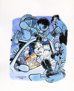 CORNILLON Luc. Okapi Encre de Chine noire et encres de couleur pour un dessin « People » paru dans le n°641 d’Okapi en 1998. Format : 22 x 30 cm. Signé.