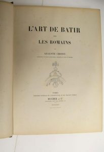 Auguste Choisy " L'art de bâtir chez les romains ". Paris, Ducher et Cie, 1873, in folio relié demi basane à nerfs (manque de cuir en tête du dos). (5 ff) 216 pages, (1 ff) (2 ff) avec 100 figures en noir in texte, suivies de XXIV planches en noir montées sur onglets gravées à pleines pages sur papier fort. Cerne claires parcourant les planches affectant ces dernières en bordures supérieures. Mors classiquement frottés. Exemplaire enrichi d'un ex dono à l'architecte René Martin (1954).