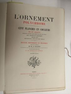 Racinet " L'ornement polychrome ". Paris, Firmin Didot, sans date (deuxième édition). In folio en feuilles sous portefeuille d'édition titré (titre manuscrit au dos). Texte de présentation et introduction. 76 planches (sur 100) or et argent. Portefeuille sali.