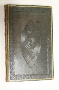 Picard et Empis " Lambert Simnel ou le mannequin politique. Comédie en 5 actes et en prose. Représentée pour la première fois au Théâtre Français par les comédiens du Roi le 24 mars 1827 ". Paris, Ambroise Dupont et Cie, 1827. In-12 relié plein maroquin, dos à nerfs orné de fers décoratifs à la lyre. Double filet sur les plats encadrant une large guirlande et un fer ovoïde strié présentant 3 disques en long striés dans leurs centres, l'ensemble frappée à froid. Mors frottés rendant la reliure fragile. Belle reliure originale de Simier.
