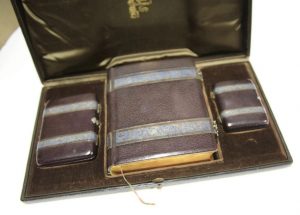 On trouvera dans le coffret à la parure identique un carnet de note avec stylet, plaque de support montée sur attache et fermoir, doublure de soie violine et un portemonnaie à 4 compartiments à la doublure de soie violine.
