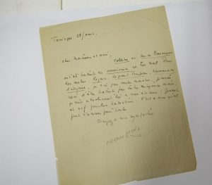 Jean Giono. Lettre autographe signée, Taninges le 28 août. 1 page recto. Lettre sans doute à un ami traducteur, Giono se plaignant de la mauvaise traduction de Colline et Un de Baumuges.