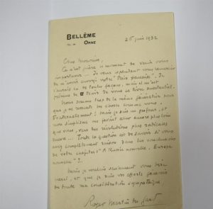 Roger Martin du Gard. A Henry de Jouvenel. Lettre autographe signée Bellême 26 juin 1932. Une page in-8.