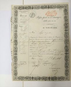 François Rude (1784-1855). Sculpteur. Document in folio marge de gauche effrangée. Passeport en date du 23 mai 1835. Fligrané à l'effigie de Louis Philippe Timbre sec. Signature de François Rude. Cachets au verso.