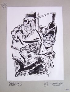 FOLLET René. 15 histoires d’arts martiaux. Encre de Chine noire pour une illustration du livre 15 histoires d’arts martiaux paru aux éditions Gautier-Languereau en 1981. Format : 16 x 21 cm. Signé.