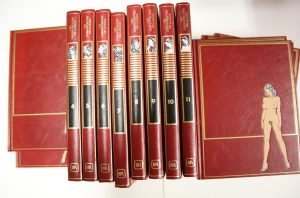 (Curiosa) Jacques Goupil " Les chefs d'oeuvre de la bande dessinée érotique ". Ed. Rombaldi 1987 / 1990. Ensemble de 15 volumes in-4 reliés plein skivertex d'édition illustré. Complet des feuillets de présentation sous portefeuille. Collection complète. Belle condition.