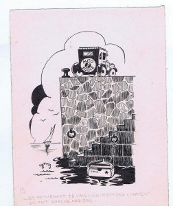 GERVY. Auto Ecole. Dessin à l’encre de Chine publié dans le journal de Périgueux L’ESSOR en 1945. Format 12,5 x 16,5 cm. Le dessin est signé.