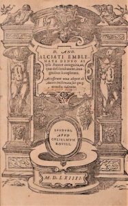 Emblemata. Lyon, Guillaume Rouillé, 1564. In-8, vélin souple (Reliure de l'époque). Nouvelle édition du plus célèbre des livres d'emblèmes, ornée de 211 figures et de beaux encadrements à chaque page, le tout gravé sur bois par Pierre Vase.