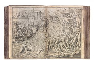 Le Imprese illustri con espositioni, et discorsi. Venise, Comin da Trino, 1572. In-4, vélin rigide, dos à nerfs avec le titre manuscrit, tranches violettes (Reliure de l'époque). Seconde édition de ce rare et beau livre d'emblèmes, procurée par Francesco Patrizi. L'originale a paru à Venise en 1566.