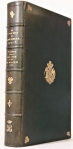 Le Parlement de Bourgogne. Son origine, son établissement et son progrès : avec les noms, sur-noms, qualités, armes et blasons. – Continuation de l'histoire du parlement de Bourgogne, depuis l'année 1649 jusqu'en 1733. Dijon, Antoine de Fay, 1733. – DES MARCHES (A.-S.). Histoire du parlement de Bourgogne de 1733 à 1790. Chalon, J. Dejussieu, 1851. Dijon, chez ledit Palliot, 1649. 3 ouvrages en un volume in-4, maroquin vert, écoinçons dorés et armes au centre, dos orné, dentelle intérieure, tranches dorées (Belz succ. Niédrée). Réunion en un volume de trois traités historiques sur le parlement de Bourgogne.