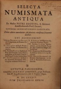 Selecta numismata antiqua ex museo Petri Seguini, ejusdem observationibus illustrata. Paris, Jean Jombert, 1684. In-4, vélin rigide ivoire, dos lisse, pièce de titre postérieure, tranches mouchetées (Reliure de l'époque). Seconde édition considérablement augmentée de ce catalogue de médailles antiques provenant de la riche collection de Pierre Seguin, doyen de Saint-Germain-l'Auxerrois. L'édition originale avait vu le jour à Paris en 1665.
