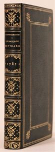 La Folle journée, ou le Mariage de Figaro, comédie en cinq actes, en prose. Paris, Ruault, 1785. In-8, maroquin vert, décor à la Du Seuil, dos orné, dentelle intérieure, tranches dorées sur marbrure (Thivet). Édition originale du chef-d'œuvre de Beaumarchais, enrichie de 5 figures de Saint-Quentin gravées par Malapeau et Roi.