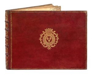 IXe recüeil d'airs nouveaux serieux et a boire. Paris, chez l'auteur, Foucault, veuve Ballard, 1710. In-4 oblong, maroquin rouge, triple filet, armoiries au centre, dos orné de fleurs de lis, dentelle intérieure, tranches dorées (Reliure de l'époque). Édition originale de ce neuvième recueil de musique composé par Jean-Baptiste de Bousset (1662-1725). Il est dédié à la duchesse de Bourgogne.
