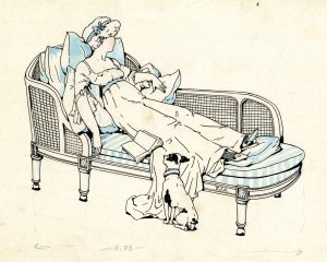 JOBBÉ DUVAL Félix. Encre de Chine noire et lavis bleu pour une illustration représentant une jeune femme allongée sur un sofa. Format : 21 x 17 cm. Signé.