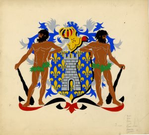 JOUBERT Pierre. Héraldique Gouache pour les armes de Laval, réalisée pour un mazagran dans les années 50 Au dos, recherche à la mine de plomb pour un dessin du Jamboree de Moisson en 1947. Format : 22 x 20 cm. Signé.