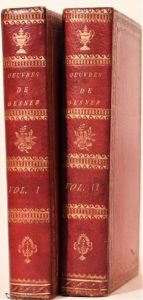 Œuvres. [Paris, Dufart], s.d. [1796]. 2 volumes in-8, maroquin rouge, triple roulette dorée, dos lisse orné, coupes décorées, dentelle intérieure, tranches dorées (Reliure de l'époque). Belle édition illustrée de 2 titres-frontispices de Marillier, gravés par Ponce, un portrait gravé par Delvaux et 24 figures de Monnet, gravées sur cuivre par Courbe, Dupréel, Giraud jeune, Letellier et Macret.