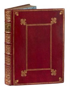 Les Amours de Daphnis et Chloé. S.l. [Paris], s.n., 1745. Petit in-4, maroquin rouge, dentelle et fleurons d'angles dorés, décor à la Du Seuil avec fleurs de lis aux angles, dos orné, pièce de titre olive, dentelle intérieure, doublure et gardes de moire bleue, tranches dorées sur marbrure (Reliure de l'époque). Charmante édition illustrée de la suite ornant la célèbre « édition du Régent », publiée en 1718.