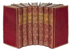 Œuvres. Nouvelle édition. Londres [Paris], s.n. [Cazin], 1784. 7 volumes in-18, maroquin rouge, triple filet, dos lisse orné, pièces de titre et de tomaison citron, dentelle intérieure, tranches dorées (Reliure de l'époque). Jolie édition de petit format publiée par Hubert Cazin.