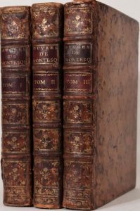 Œuvres. Amsterdam et Leipzig [Paris], Arkstée & Merkus [Huart et Moreau], 1758. 3 volumes in-4, veau marbré, dos orné, tranches rouges (Reliure de l'époque). Seconde édition collective, posthume, établie d'après les manuscrits et les variantes trouvés dans les papiers de l'auteur, sous la direction de François Richer et du fils de Montesquieu, Jean-Baptiste de Secondat.