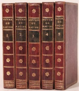 Œuvres. Imprimé par ordre du Roi pour l'éducation de Monseigneur le Dauphin. Paris, Didot l'aîné, 1784. 5 volumes in-18, maroquin rouge, triple filet, dos lisse orné, pièces de titre et de tomaison vertes, dentelle intérieure, tranches dorées (Reliure de l'époque). Édition imprimée à 450 exemplaires sur papier vélin d'Annonay pour la Collection des classiques françois et latins inaugurée par François-Ambroise Didot en 1783. Trente-deux titres parurent jusqu’en 1789, édités en trois formats différents : l’in-4, l’in-8 et l’in-18.