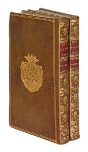 Les Faux pas, ou les mémoires vrais, ou vrai-semblables de la baronne de ***. Traduits de l'original bas-breton. Deux-Ponts ; [Paris], Duchesne, 1755. 2 volumes in-12, maroquin citron, triple filet, armoiries au centre, dos lisse orné, pièces de titre et de tomaison rouges, dentelle intérieure, tranches dorées (Reliure de l'époque). Édition originale de ce roman anonyme dû à Rousseau de Toulouse, le fondateur du Journal encyclopédique et de la Société typographique de Bouillon.