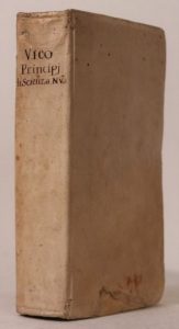 Principi di scienza nuova d'intorno alla comune natura delle nazioni. Naples, Stamperia Muziana, aux dépens de Gaetano et Steffano Elia, 1744. 2 tomes en un volume in-8, vélin rigide, dos lisse avec le titre manuscrit, tranches mouchetées (Reliure de l'époque). Troisième édition en partie originale ; posthume, elle donne le texte définitif de l'ouvrage.