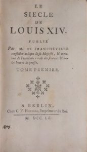 Le Siècle de Louis XIV. Berlin, C. F. Henning, 1751. 2 tomes en un volume in-12, veau fauve, dos orné, pièces de titre rouge et de tomaison noire, tranches marbrées (Reliure de l'époque). Édition originale d'un des chefs-d'œuvre de Voltaire, publié sous le prête-nom de M. de Francheville.