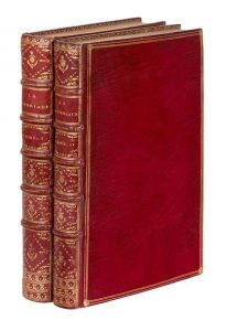 La Henriade. Paris, Veuve Duchesne, Saillant, Desaint, Panckoucke et Nyon, [1769]-1770. 2 volumes in-8, triple filet, dos orné, dentelle intérieure, tranches dorées, étui (Reliure de l'époque). Premier tirage de cette remarquable illustration de Charles Eisen, comprenant un frontispice, un titre gravé avec le portrait de l'auteur, 10 figures hors texte et 10 vignettes, le tout gravé en taille-douce par de Longueil d'après Eisen.