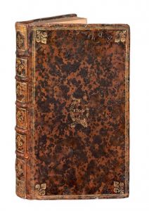 ou calendrier pour l'année mil sept cens. Paris, Pierre de la Carrière, [1700]. In-8, veau marbré, triple filet, fleurs de lis aux angles, date 1700 dans un médaillon central, dos orné de fleurs de lis, dentelle sur les coupes, tranches dorées (Reliure de l'époque). Édition absolument rarissime de cet almanach, dont on n'a pu trouver aucun exemplaire dans les dépôts publics.