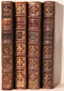 Ensemble 6 volumes. Paris, Laurent d'Houry, [1711-1718]. Almanach royal pour l'an 1711. In-8, veau marbré, filets dorés et fleurs de lis dorées aux angles, dos orné de fleurs de lis dorées, tranches dorées (Reliure de l'époque). Calendrier interfolié. De la bibliothèque du baron Jacques de Reinach, maire de Nivillers (Oise), avec ex-libris. Reliure frottée. Rare.