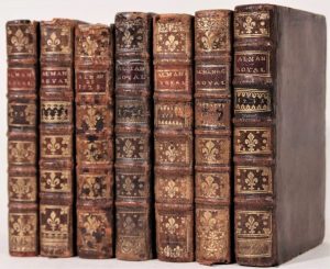Ensemble 6 volumes. Paris, Laurent d'Houry [puis] Veuve d'Houry, [1723-1737]. Almanach royal pour l'année 1723. Paris, Laurent d'Houry, 1723. In-8, veau fauve, filets à froid, dos orné de fleurs de lis dorées, tranches mouchetées (Reliure de l'époque). Calendrier interfolié. Manques aux pages de gardes et au plat supérieur.