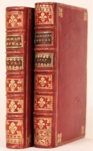 Almanach royal pour l'an bissextil 1724. Paris, Laurent d'Houry, 1724. In-8, maroquin rouge, double filet et fleurs de lis dorés aux angles, dos orné de fleurs de lis dorées, tranches dorées (Reliure de l'époque). Bel exemplaire au calendrier interfolié.