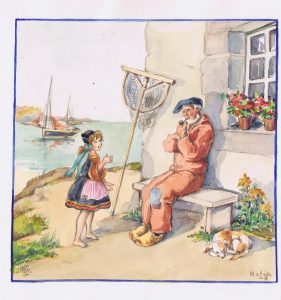 MATÉJA. La Petite Sardine. Ensemble de 12 gouaches en couleurs pour l’album LA PETITE SARDINE. CONTE BRETON publié chez Artima dans l’immédiat après-guerre. Soit la totalité des illustrations, couverture comprise. Joint le manuscrit...